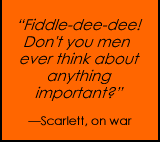 "Fiddle-dee-dee! War, war, war. This war talk's spoiling all the fun at every party this spring. I get so bored I could scream. Besides, there isn't going to be any war." These opening lines of Scarlett establish her relationship to the war.