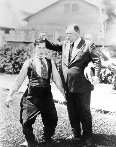 Buster Keaton and Fatty Arbuckle clowning around.