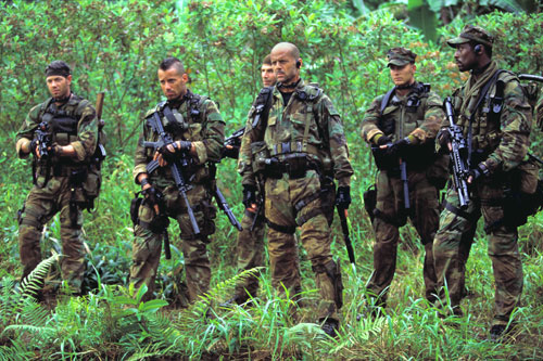 A Navy SEAL team is dropped into central Africa in Tears of the Sun: (left to right) Paul Francis, Johnny Messner, Nick Chinlund, Bruce Willis, Cole Hauser, and Eammon Walker.(© 2003 Columbia Pictures Industries. All rights reserved.)