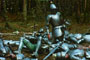 One of the film's most brilliant sequences shows a riderless, seemingly panicked horse, racing through the dark forest. The camera twice pauses on a riveting image of a dying knight, blood spraying from his punctured armor. Another is the final scene in which Mordred's forces, hidden in trees, attack Lancelot and his men with arrows. The last shot shows a pile of armor-clad bodies, a gruesome heap that recalls the masses of bodies seen in Nazi atrocity footage. This tableau of humankind as ultimately little more than a twisted mass of blood and steel is perhaps Bresson's definitive take on the human condition. Unlike Fontaine and Jost, these men don't escape.