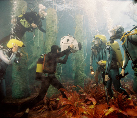 Members of Team Zissou shoot underwater in a surreal deep-sea forest in The Life Aquatic with Steve Zissou.(© 2004 Buena Vista Pictures Distribution. All rights reserved.)