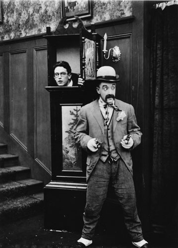 Harold Lloyd (in clock) and Snub Pollard in "Bumping into Broadway."(Photo courtesy of Kino International.)
