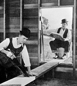 Oliver takes a break while Stan saws a plank in "The Finishing Touch."(© 1998 Hal Roach Studios. All rights reserved.)