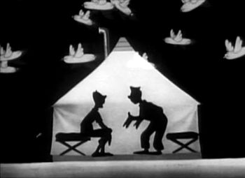 Thanks to loose-lipped soliders, flying baloney fills the sky in "Rumors."(© 1990, 1993 Bosko Video. All rights reserved.)