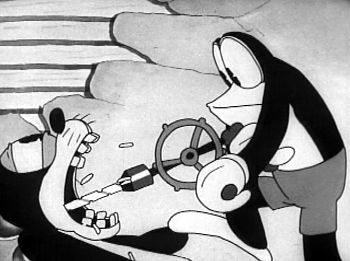 Flip the Frog works as a dentist in "Laughing Gas." At this point, human characteristics have been added to Flip, but he is still recognizably a frog.(© Celebrity Productions, Inc. Renewed by Film Preservation Associates. All rights reserved.)