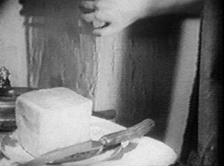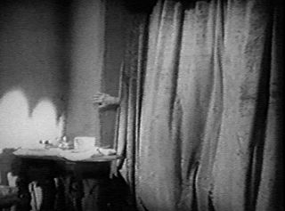 Alice blindly grabs for anything. Her hand reaches beyond the curtain and finds a night stand--and on the night stand her fingers curl around a knife.(Photo credit: © 1929 British International Pictures.)