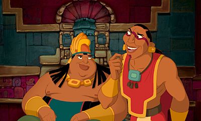 The Chief and the High Priest Tzekel-Kan vie for the approval of Tulio and Miguel, who they believe to be gods, in The Road to El Dorado.(© 2000 Dreamworks L.L.C. All rights reserved.)
