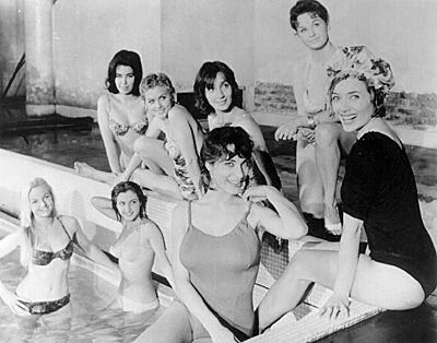 Stephane Audran (far right) as Ginette, Bernadette Lafont (center) as Jane, Clotilde Joano (behind Lafont) as Jacqueline, and Lucile Saint-Simon (left of Joano) as Rita in Les Bonnes Femmes.(Photo courtesy of Kino International)