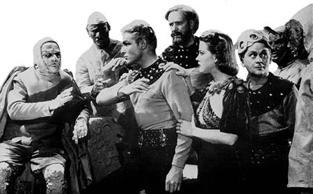 In addition to the mechanical men, Conquers the Universe also features a race of men from "The Land of the Dead" who wear costumes that make them look like pointy-headed walking rocks. Unlike most serial characters, they don't speak English. They speak an obscure, strange-sounding tongue. Their speech is realized by playing their dialogue backwards. (Of course, Zarkov not only identifies the language of the Rock Men -- he can speak it!)