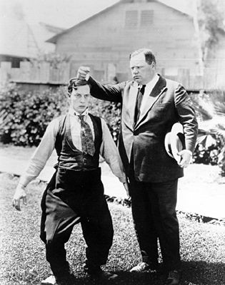Buster Keaton and Fatty Arbuckle clown for a publicity photo.(Photo courtesy of Kino International Corp.)