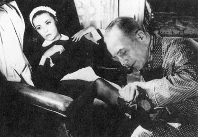 Célestine (Jeanne Moreau) submits to the "whims" of Monsieur Rabour (Jean Ozenne) in Diary of a Chambermaid.