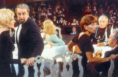 In a dream sequence, the dinner-goers suddenly find themselves on a stage. From The Discreet Charm of the Bourgeoisie.