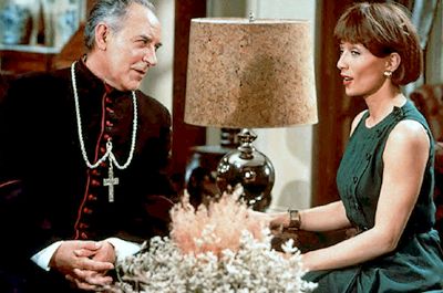 Bishop Dufour (Julien Bertheau) engages Madame Alice Senechal (Stephane Ardan) in a conversation during The Discreet Charm of the Bourgeoisie.