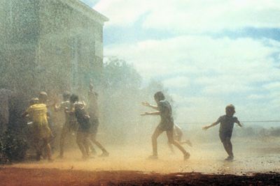 When David reluctantly agrees to defend a group of Aborigines accused of killing one of their own, his visions grow even more bizarre. One of the men, Chris Lee (played by David Gulpilil of Nicolas Roeg’s Walkabout), starts turning up in David’s visions, and the two of them form a kind of antagonistic bond. David thinks Chris knows the reason behind it all -- the murder, the visions -- but Chris remains aloof. When David invites Chris to his home for dinner, much to the bewilderment of David’s proper wife, Chris brings a guest, an elder Aboriginal man named Charlie. Charlie doesn’t speak English but he takes a keen interest in several photos of David’s great-grandfather for reasons revealed only at the movie’s conclusion. Charlie casts a pall over David’s household. His wife (Olivia Hamnett) can’t understand why David is so drawn to him. But David is possessed, it seems, by Charlie’s intensity. As the legal proceedings fade in importance, David becomes caught up in the spiritual explanation for the murder. Is Charlie a tribal man? Was the murder a ritual tribal killing? The answer would seem to be no. Tribal people, we’re told, live in the wilderness, in the far north or west. Charlie (and Chris, too) lives in Sydney. According to Australian law, urban Aborigines are "no different from depressed whites." Or so we think. As Chamberlain’s David delves, or sinks, deeper into Aboriginal culture, he discovers that nothing is what it seems, including his own identity. Weir is adept at evoking normalcy teetering on the edge of who-knows-what. There are stretches in The Last Wave in which it feels as if everything is about to be revealed, but then Weir pulls back from the edge, leaving us to guess at the possibility of what was to come. In the end, The Last Wave isn’t about who’s responsible for the murder, or even David’s role in the cosmic scheme of things. The Last Wave, which was written by Weir, Tony Morphett, and Petru Popescu, is about the sheer enormity of the unknown. When David witnesses the titular final wave, we only see a close-up of his face, his expression paralyzed with fear. It is a face that has foreseen the apocalypse and must live with that horrible knowledge. If David represents white Australian sensibilities, then the movie sees western Australian civilization as a doomed culture. It is powerless against the larger supernatural forces at work, all of them unknowable, all of them unstoppable.