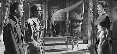 Pierre Lantin (second from left, Dario Michaelis) and a police inspector confront Gisele du Grand (Gianna Maria Canale) in I Vampiri.