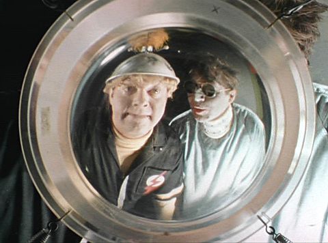 Dr. Breedlove's advanced video screen technology allows the alien Sterilox (left, Frank Coe) to check out the lingerie-clad creations keeping fit in the dungeon exercise room in Kiss Me Quick!(© 2001 Something Weird Video. All rights reserved.)