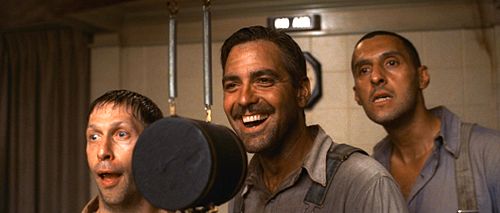 Prison chain gang escapees Delmar (Tim Blake Nelson, left), Ulysses Everett McGill (George Clooney, center) and Pete (John Turturro, right), find themselves in a make-shift recording studio singing a song that miraculously becomes a runaway hit in O Brother, Where Art Thou? (© 2000 Touchstone Pictures/Universal Studios. All rights reserved.)PREVIOUS | NEXT | RETURN TO REVIEW