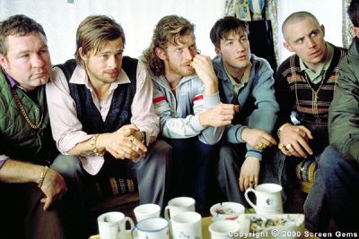 Second from left -- Mickey (Brad Pitt) and Darren (Jason Flemyng) have tea with their gypsy brood in Snatch.(© 2000 Screen Gems. All rights reserved.)