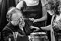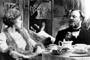 Sternberg shot The Blue Angel with four cameras running simultaneously, much like American television situation comedies of the '50s and '60s (such as I Love Lucy). The camera rarely moves; however, in a few scenes (usually in larger rooms/sets) Sternberg provides more variety in shot selection. In Rath's classroom, for example, Sternberg supplies one of the movie's modest tracking shots (of little more than a dozen feet in length). While Sternberg's usual penchant for stylized visuals is subdued in The Blue Angel, you'll still find hints of Sternberg's presence. For example, Sternberg turns the city streets into ominous, expressionistic narrow avenues of rough surfaces and teetering angles. Visual symbolism appears throughout The Blue Angel, such as when Professor Rath first enters the cabaret: he literally stumbles into a net. Somewhat more subtle is the Professor's cluttered apartment: shadows make the room resemble a prison. More felicitous is Sternberg's use of an elaborate clock with large human figures that move about its face -- a forerunner of the more elaborate statues used by Sternberg in The Scarlet Empress.