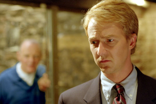 RETURN TO REVIEW | PREVIOUS PIC | NEXT PICAnthony Hopkins and Edward Norton in Red Dragon.(© 2002 Universal Pictures. All rights reserved.)