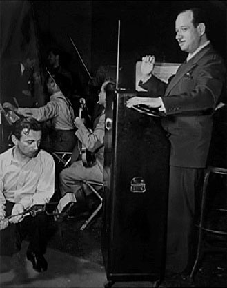 Miklos Rozsa (left) kneels as Dr. Samuel Hoffman plays the theremin, a publicity still for Spellbound.(© American Broadcasting Companies, Inc. All rights reserved.)