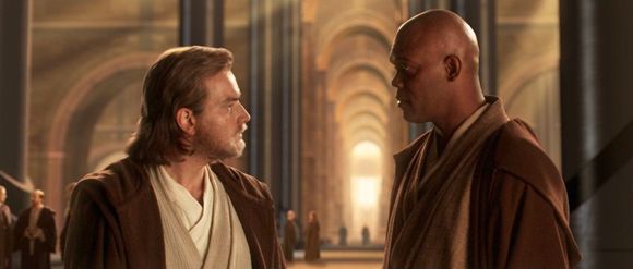 Obi-Wan Kenobi (Ewan McGregor) and Mace Windu (Samuel L. Jackson) in Star Wars: Episode II - Attack of the Clones.(© 2002 Twentieth Century Fox. All rights reserved.)