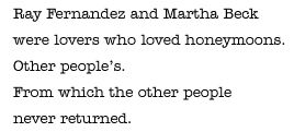 Martha Beck and Ray Fernandez killed as many as 20 people in a scheme to bilk lonely women out of their savings. Martha and Ray were finally convicted of murder in three cases and sentenced to the electric chair. Martha was overweight and unmarried and destined to remain that way until she communicated with Ray through a "Friendship Club." After trading letters with him for several weeks, they finally met, and it was love at first sight. She gave up her job as a head nurse at a hospital in order to be Ray's constant companion. But Ray's only source of income was in bilking lonely women out of their savings. So with Martha posing as his sister, Ray continued to ply his trade. Martha even watched as Ray married some of these women so that he could get closer to their bank accounts. But Martha's deep insecurity about her looks and her suspicions about Ray's philandering ways sowed deep conflicts, leading to arguments and eventually murder. In the most carefully documented case, Martha took a hammer and crushed the skull of a Florida woman who had drawn her entire savings out of the bank and accompanied Ray and Martha back to New York. Ray then finished the job by strangling the woman and burying her body in the basement of his house. Ray and Martha went to the electric chair while continuing to profess their love.