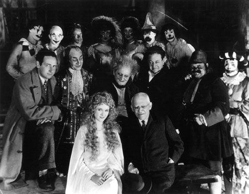 Front row: Mary Philbin and Carl Laemmle. Second row: Paul Kohner, Brandon Hurst, Cesare Gravina, Paul Leni, and extras. Publicity still for The Man Who Laughs.(Photo courtesy of Kino International.)