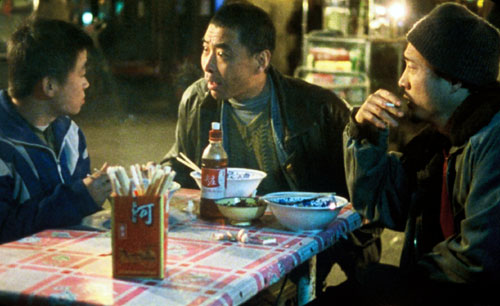 Wang Baoqiang as Yuan Fengming (left), Wang Shuangbao as Tang Zhaoyang (center), and Li Yixiang as Song Jinming (right) in Blind Shaft.(Photo couresty of Kino International.)