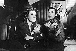 Mrs. Miniver (Greer Garson) and her husband (Walter Pidgeon) protect their children in an air raid shelter in Mrs. Miniver.