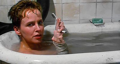 While taking a bath (notice the filthy bath water!), Jill Layton (Kim Greist) hears a noise in her apartment.(© 1985 Embassy International Pictures NV. All rights reserved.)