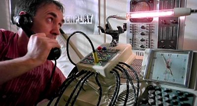 Sam's house is filled with electrical equipment, such as this elaborate alarm clock and telephone, but nothing seems to operate correctly.(© 1985 Embassy International Pictures NV. All rights reserved.)