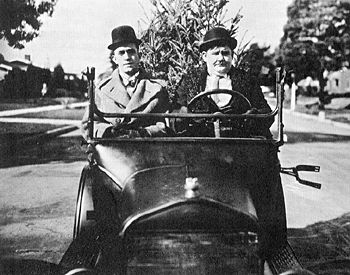 Stan and Oliver play door-to-door Christmas tree salesman in "Big Business." They're on their way to try and sell James Finlayson a tree.(© 1998 Hal Roach Studios. All rights reserved.)