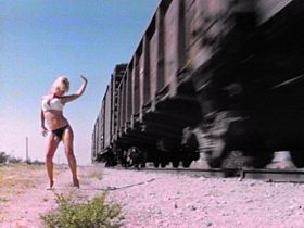 Barbette Bardot dances beside railroad tracks in Mondo Topless.(© 1999 RM Films International Inc. All rights reserved.)