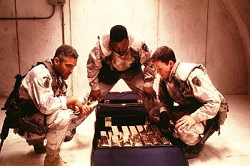 George Clooney, Ice Cube, and Mark Wahlberg in Three Kings.(© 1999 Warner Bros. All rights reserved.)