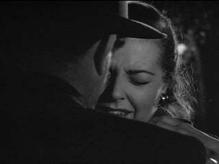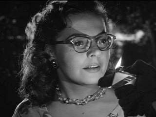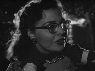 When Miriam ditches her escorts--perhaps in hope of talking to Bruno--he surprises her. His hands swiftly and assuredly find her throat. Miriam's glasses fall off.(Photo credit: © 1951, Renewed © 1951 Warner Bros. All rights reserved.)