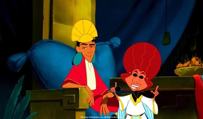 In his perfect world, arrogant young Emperor Kuzco (left) even has his own "theme song guy" (right) to serenade him in The Emperor's New Groove.(© 2000 Disney Enterprises, Inc. All rights reserved.)