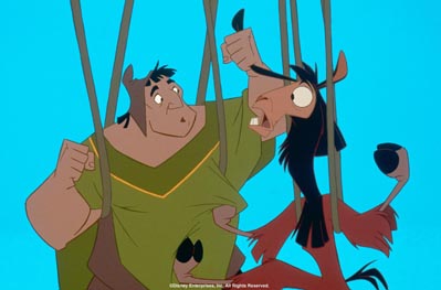 | Following a disagreement, Emperor Kuzco (right) -- who has been turned into a llama by his scheming royal advisor -- and a good-hearted peasant named Pacha (left) find themselves dangling dangerously high above a deep gorge in The Emperor's New Groove. |