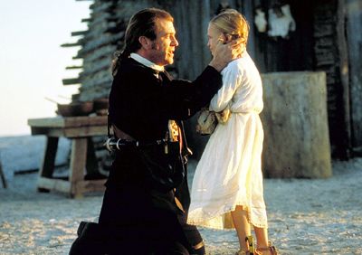 Benjamin Martin (Mel Gibson) bids a tearful farewell to his youngest child, Susan (Skye McCole Bartusiak), before setting off to join the Continental Army in The Patriot.(© 2000 Sony Pictures Entertainment Co. All rights reserved.)