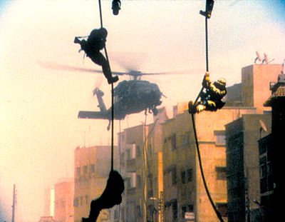 Ameircan troops descend upon Mogadishu in Black Hawk Down.(© 2001 Revolution Studios. All rights reserved.)