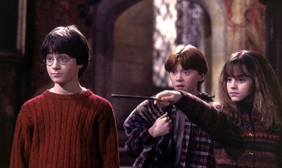 Harry (Daniel Radcliffe) and Ron (Rupert Grint) watch as Hermione (Emma Watson) casts a spell in Harry Potter and the Sorcerer's Stone.(© 2001 Warner Bros. All rights reserved.)