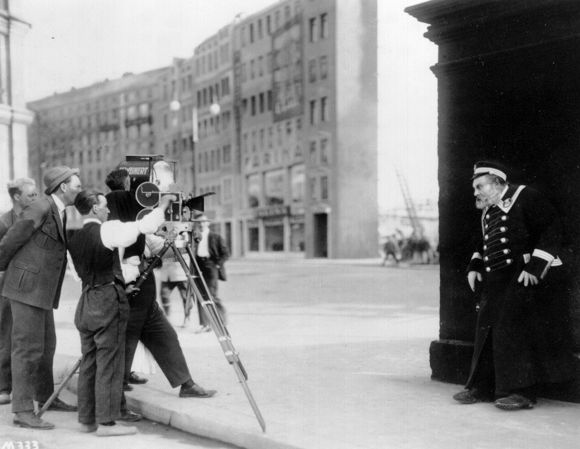 F.W. Murnau (with hat) directing Emil Jannings (far right) in The Last Laugh.(photo courtesy of Kino International)
