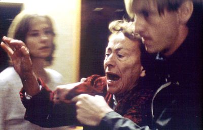 Isabelle Huppert as Erika), Annie Girardot as Madame Kohut, and Benoît Magimel as Walter Klemmer in The Piano Teacher.(© Kino International. All rights reserved.)